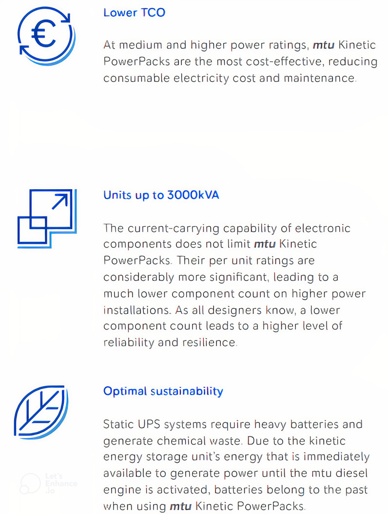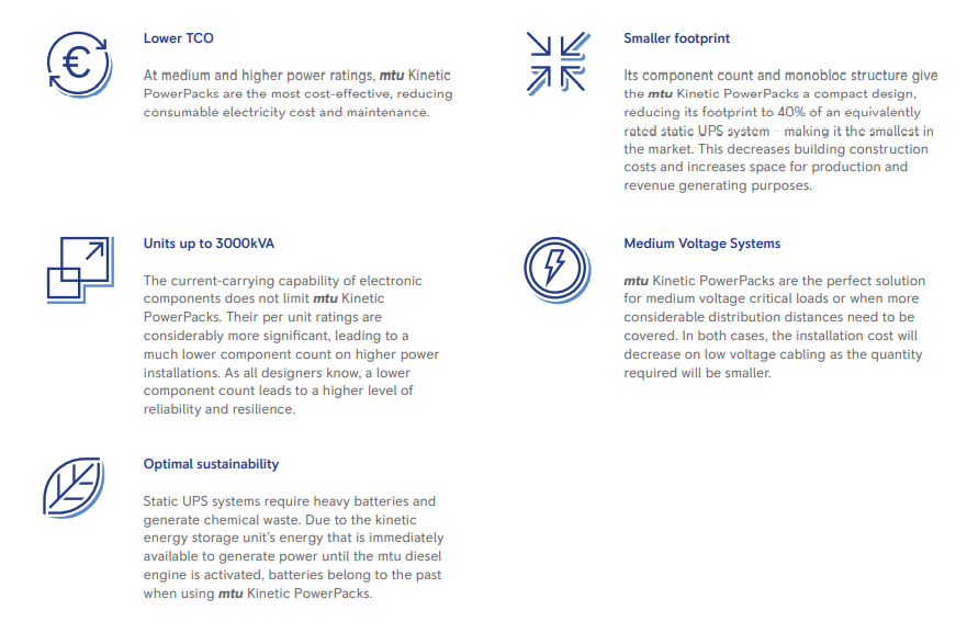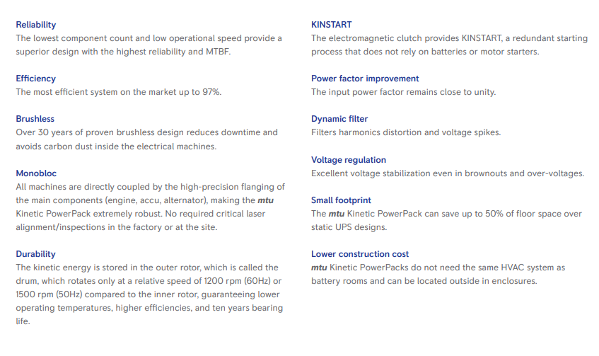 The mtu Kinetic PowerPack perfectly answers all your specific needs regarding power, footprint, and sustainability. The dynamic UPS technology is based on kinetic energy and consists of a diesel engine coupled to a kinetic energy accu via an electromagnetic clutch. mtu Kinetic PowerPacks ensure reliable and environmentally friendly uninterruptible electrical power and power conditioning.